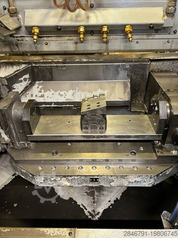 Обрабатывающий центр с интегрированной автоматизацией и палетизацией, управление Fanuc, 12 инструментальных позиций, HSK 32, 15 000 об/мин, 4-я ось, сменный стол, пневматические тиски, вытяжка, стружкоуборочный транспортер, система охлаждения Knoll,