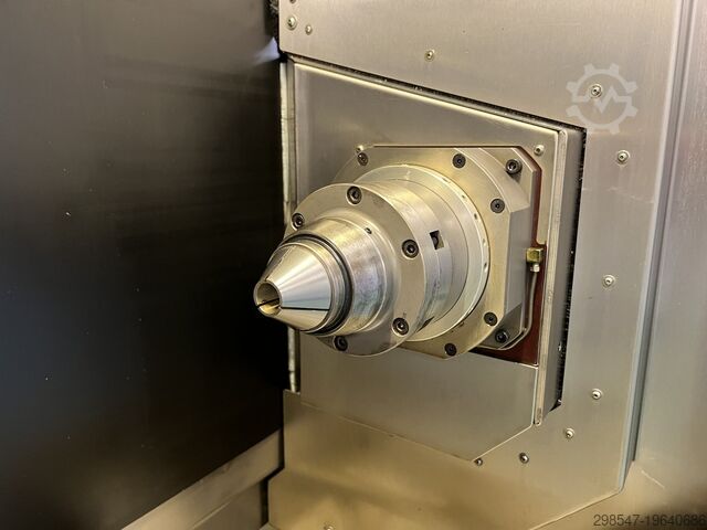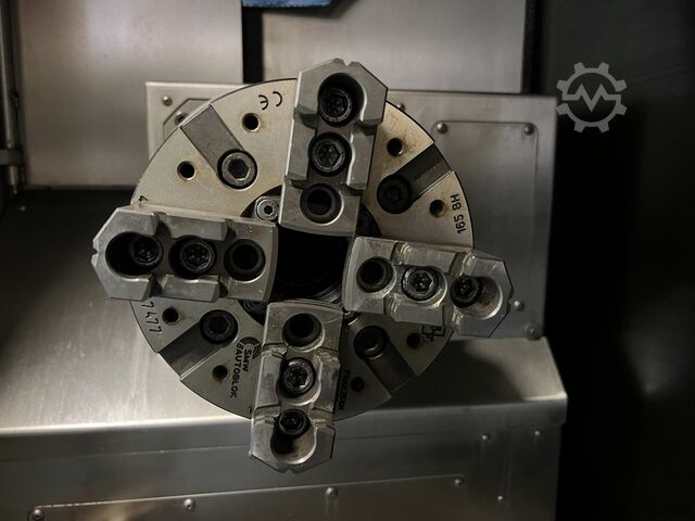 2 токарных электрошпинделя (близнецы): 6 000 постоянных и 8 000 пиковых об/мин, макс. мощность 18,7 кВт, проход прутка 40 мм, 2 группы цанг и 1 самоцентрирующийся 4-кулачковый гидравлический патрон Ø165 мм