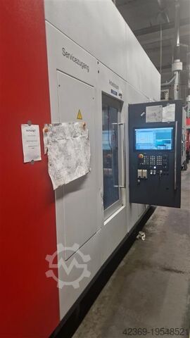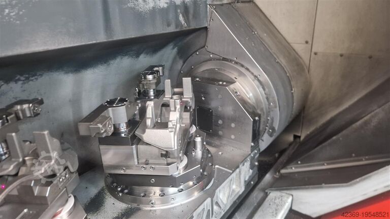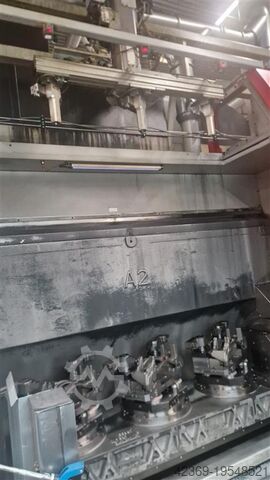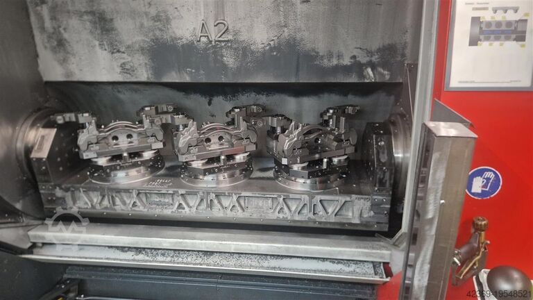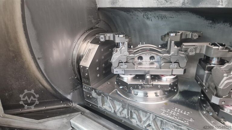 Высокоточный горизонтальный обрабатывающий центр с ЧПУ, одновременно по 5 осям, с тремя шпинделями и управляемым маятниковым двухпозиционным сменщиком заготовок; с каждой стороны по 3 поворотных Torque-drive стола.