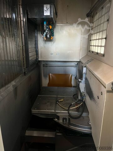 Полностью укомплектованный станок с поворотным столом, поддоном для охлаждающей жидкости и транспортером для стружки, готовый к эксплуатации.