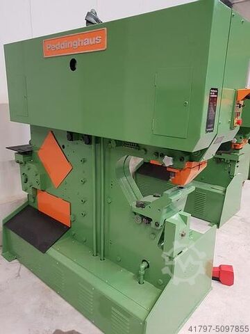 Максимальное усилие пробивки: 1100 кН Максимальное усилие сдвига: 1700 кН Глубина пробивки: 510 мм Отверстия 31 в 25-мм полосовой стали: 500 x 22 мм Гидравлическое прижимное устройство для плоского стального ножа Вырубной пресс с квадратной головкой Вес: около 5000 кг