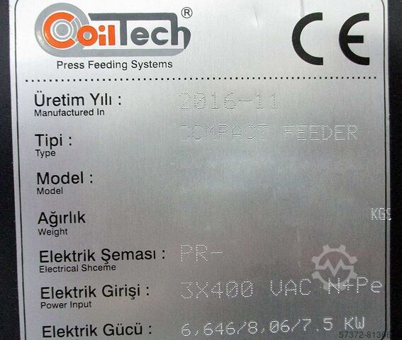 Coiltech Decoiler Straightener Feeder System - это компактная система подачи для прессов. Ширина ленты: 600 мм, толщина материала: до 6,5 мм, правильные ролики: 7x115 мм, тоннаж барабана разматывателя: 6000 кг, диаметр (внутренний), min-max: 470-520 мм. Подключаемая нагрузка: 7,5кВт, с документацией.