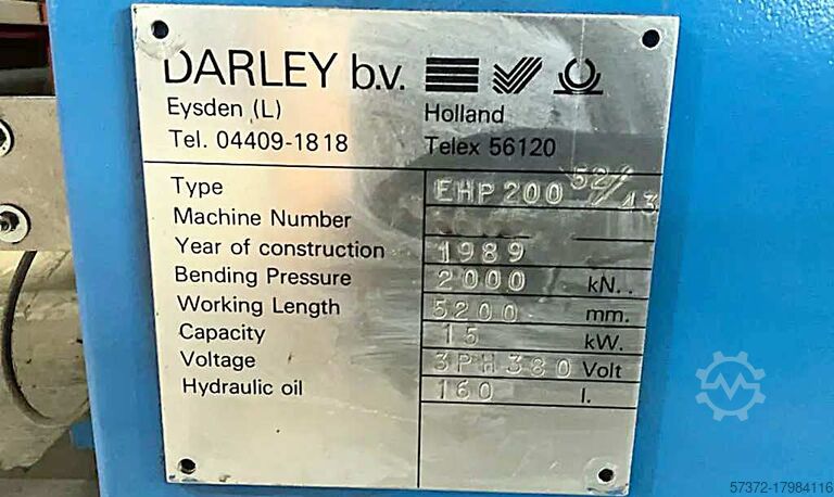 Имеется листогибочный станок с ЧПУ Darley. Усилие прессования: 2000 кН, рабочая ширина: 5200 мм, мощность: 15 кВт, емкость для масла: 160 л, размеры станка X/Y/Z: ок. 5500 мм/1900 мм/3100 мм, вес: ок. 20000 кг. Включая инструменты и принадлежности. Документация в наличии. Возможен осмотр на месте.