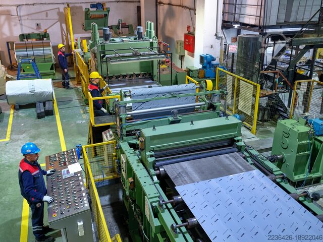 • Линия включает: тележку для рулонов; раздвижную оправку; разматыватель с демпферным роликом; прижимные ролики; 23-валковую правильную машину (11/12); летучие ножницы; выходной стол; двойные укладочные устройства.