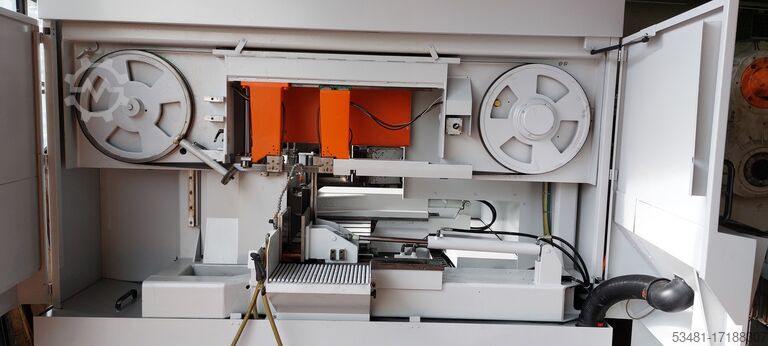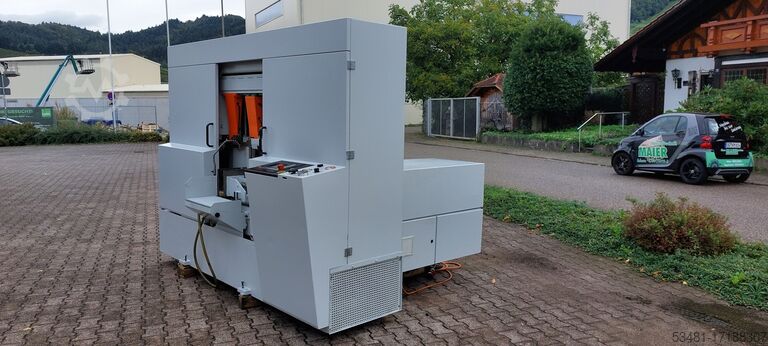 Полностью гидравлический высокопроизводительный ленточнопильный автомат особо тяжелой конструкции, с горизонтально параллельно перемещающейся пилой, предназначен для резки профилей, труб и цельного материала всех марок, включая крайне трудные в обработке материалы (например, титан, инконель, хастеллой). Подходит для использования биметаллических и твердосплавных ленточных пил. Пильный агрегат выполнен из массивного полимербетона, что обеспечивает максимальную плавность хода и долговечность ленточных пил. Направление пильного агрегата осуществляется по двум вертикальным квадратным колоннам (двойное колонное исполнение) с закаленными и шлифованными направляющими. Гидравлическое натяжение ленты и предварительно напряженные гидравликой твердосплавные направляющие пилы. Зажим материала осуществляется двумя горизонтальными рамными тисками. Подача материала через встроенный в станок не приводной рольганг с двенадцатью транспортировочными роликами, что позволяет легко транспортировать даже короткие остатки.