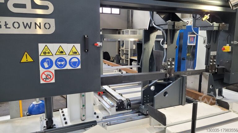 Вертикальные стойки из специально подобранной профильной стали. Направляющие рычага - прецизионные направляющие с предварительным натяжением. Движение руки контролируется двумя шариковинтовыми парами, механически связанными друг с другом с помощью редукторов и сервомотора. Станок оснащен механизмом гидравлической разгрузки болтов крепления кронштейна для уменьшения давления на гайки ШВП, что увеличивает срок службы. Использование шарико-винтовой передачи для подачи манипулятора обеспечивает постоянный контроль скорости подачи, особенно при минимальных скоростях резания, при этом параметр скорости подачи задается с панели управления. Станок оснащен системой измерения скорости спуска стрелы, отображаемой на панели управления, и системой управления изгибом. Управление направляющей ленты (управление изгибом) будет связано с механизмом привода подачи стрелы. При отклонении ленты автоматически выполняется коррекция скорости подачи, после возвращения ленты к правильному значению скорость подачи автоматически возвращается к исходному значению. При превышении заданного значения отклонения ленты (косой рез) станок остановит процесс резки и визуально (индикаторная лампа) сообщит о проблеме.