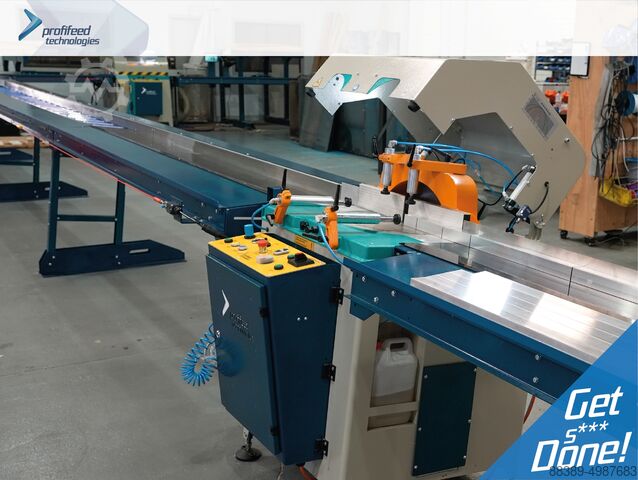 Опциональный полностью автоматический поточный оптимизатор. Автоматическое измерение длины алюминиевого профиля с помощью лазерного датчика и оптимизация списка заданий на лету в соответствии с измеренной длиной для минимизации потерь в обрезках. Автоматическая печать этикеток с номером задания / детали для каждой изготовленной детали (опция).