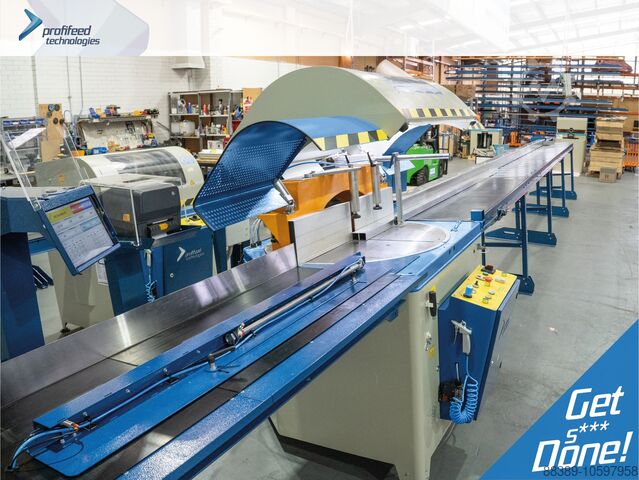 Опциональный полностью автоматический поточный оптимизатор. Автоматическое измерение длины алюминиевого профиля с помощью лазерного датчика и оптимизация списка заданий на лету в соответствии с измеренной длиной для минимизации потерь в обрезках. Автоматическая печать этикеток с номером задания / детали для каждой изготовленной детали (опция).