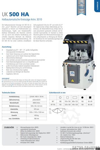 Полуавтоматическая дисковая пила UK 500 HA является станком "восходящего реза" и используется в основном для резки профильных материалов из литого алюминия, меди и твердых пластмасс (условно твердый материал). Станок характеризуется простотой в обращении и быстрой удобной сменой материала, а также простой регулировкой угла торцевания. Станок UK 500 HA имеет плавную регулировку угла торцевания в диапазоне до 30° слева и 0° справа. Подача пилы осуществляется автоматически одним нажатием кнопки, материал зажимается двумя пневматически управляемыми вертикальным и горизонтальным зажимными цилиндрами. Система минимальной смазки и пневматический пистолет для очистки станка входят в стандартную комплектацию этого станка! К станку можно подключить систему удаления стружки.