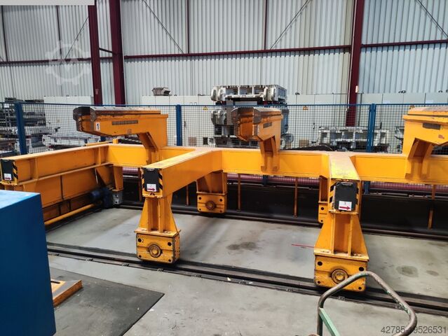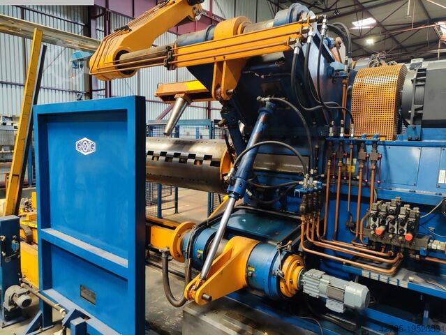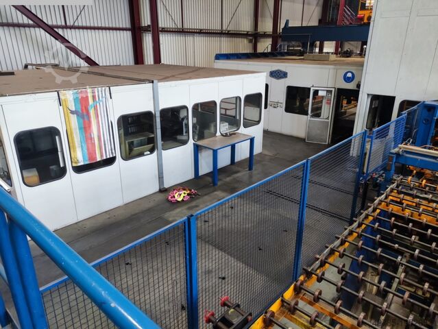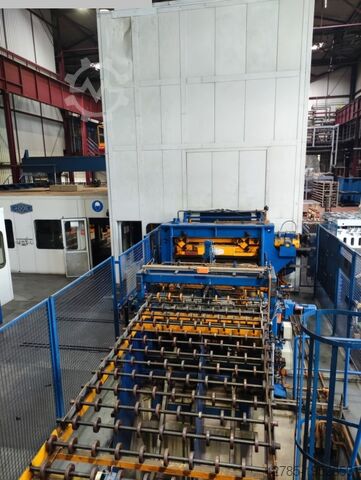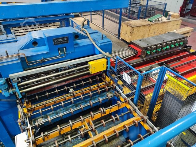 Установка подходит для ширины ленты 300–1600 мм и толщины ленты 0,5–3 мм. Станок оснащён двумя выдвижными столами с фронтальной сменой. Сбоку расположена укладочная установка с двумя поддонами. Укладка также возможна сзади с 2 поддонами. Тройная подача рулонов по 25 т, размотчик Schnutz, подающий участок, правильная машина и роликовый подающий механизм.