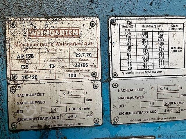 Усилие прессования: 125 т, макс. толщина материала: 13 мм, частота хода: 44/66 ходов/мин, ход ползуна: 20–120 мм, регулировка ползуна: 100 мм, мин. высота X/Y: 300 мм/400 мм, макс. высота X/Y: 350 мм/450 мм, время слежения: 0,29 с, безопасное расстояние: 390 мм. Возможен выездной осмотр.