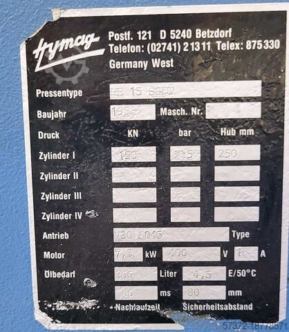 Доступен гидравлический пресс Hymag. Усилие прессования: 15 т, давление прессования: 235 бар, ход: 250 мм, привод: V30 D045, мощность двигателя: 7,5 кВт, потребность в масле: 200 л, время выдержки: 40 мс, безопасное расстояние: 80 мм. В машине обнаружена утечка в поршне, и система измерения положения работает неправильно. Документация доступна. Возможен выездной осмотр.