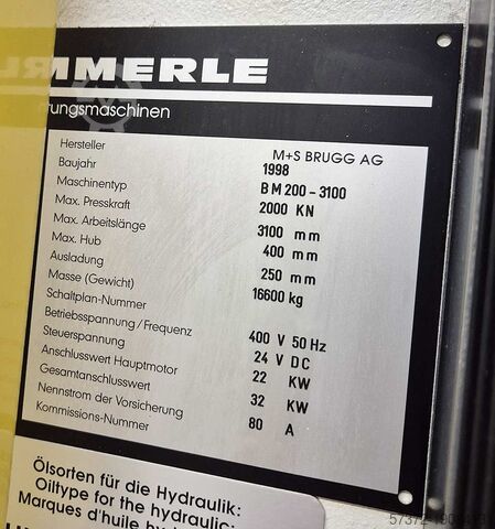 Усилие прессования: 2000 кН, рабочая ширина: 3100 мм, просвет колонны: 3240 мм, макс. ход: 400 мм, горловина: 250 мм, макс. высота установки: 965 мм, оси ЧПУ: 11, объем гидравлики: 550 л, размеры станка X/Y: прибл. 4400мм/3400мм, вес: прибл. 16600кг, управление: Cyb-Tech Infinitron. Документация доступна. Возможен выездной осмотр.