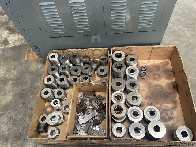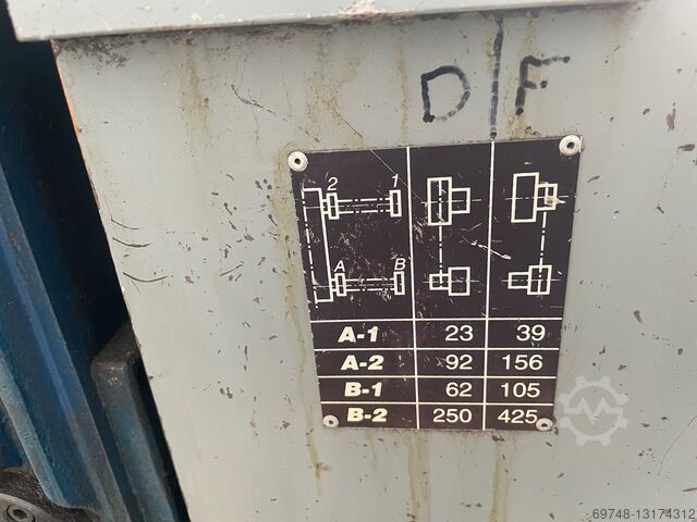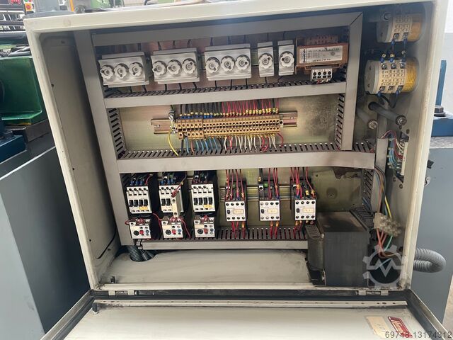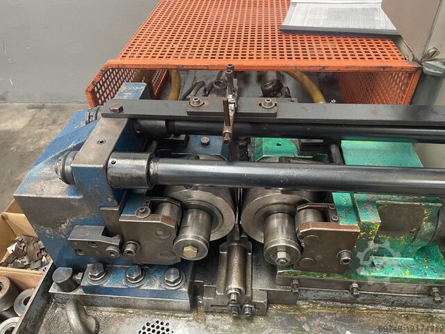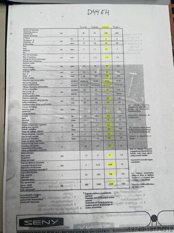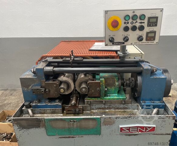 Seny 2-х роликовый гидравлический резьбонакатной станок, Mod D-44 EH, гидравлический привод, ручной и автоматический цикл, регулируемая скорость вращения роликов. макс. диаметр резьбы 40 мм, мин. диаметр 3 мм, шаг до 3,5 мм, макс. шаг 1,75 мм, макс. ширина ролика 80 мм, мин. диаметр ролика 80 мм, макс. 120 мм, скорость вращения вала 47-94, диаметр вала ролика 40 мм, расстояние между валами мин. 80 мм, макс. 165 мм,рабочий ход 7max , скорость подачи от 0,5 до 6 мм/с, время прокатки от 0,1 до 100 секунд, наклон вала +-5º, мощность основного двигателя 3 кВт, общая установленная мощность 4,68 кВт, объем бака 150 л, масса около 1100 кг, оснащен несколькими вальцами.