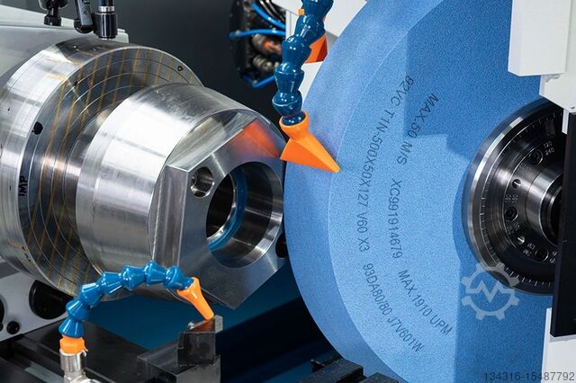 Однодисковый станок угловой / прямой, но возможен и двухдисковый с осью B и внутренним шлифовальным шпинделем.