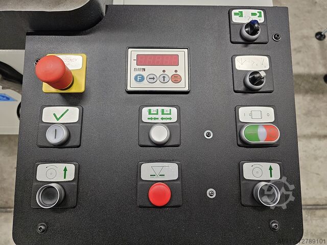 Одноголовочный пильный станок с подачей пильного полотна вверх Ø 550 мм и ручным позиционированием вертикальной оси FOM INDUSTRIE PANDA 550 с измерительным роликовым конвейером ASSOMAK VS 7 м и входным конвейером PORTER 4,2 м, год выпуска 2021