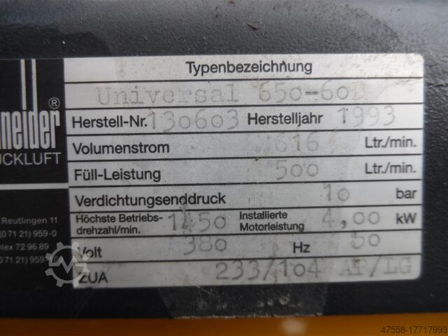 Поршневой компрессор: марка Schneider тип Universal 650-60D, год выпуска: 1993