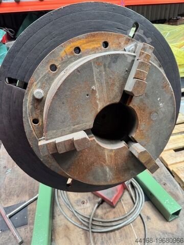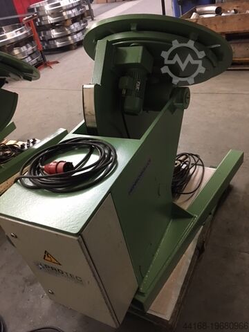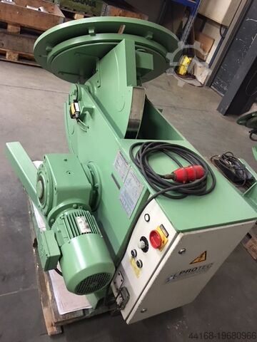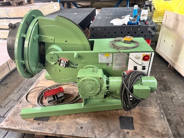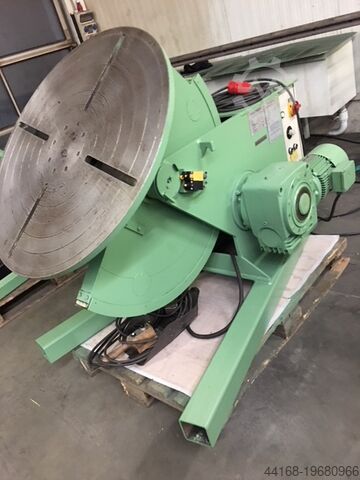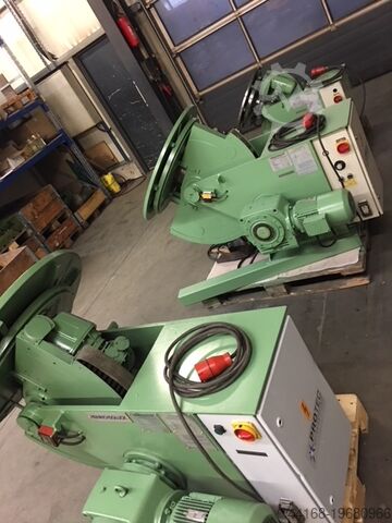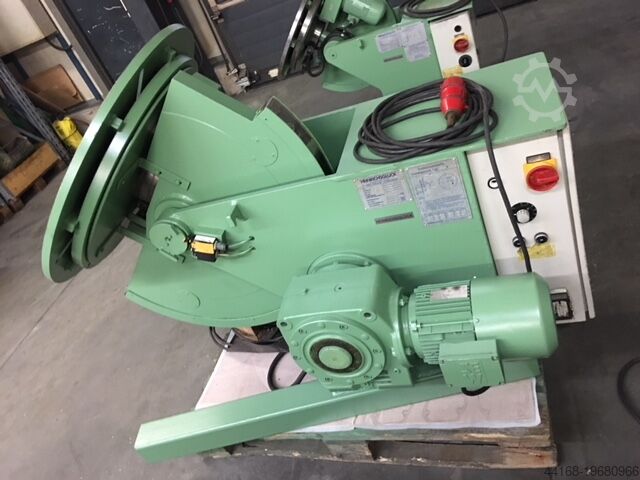 Поворотный сварочный стол, нагрузка 600 кг, комплект с патроном. Частота вращения и угол наклона плавно регулируются. Диаметр 850 мм. Высота по центру при вертикальном диске 700 мм. Высота в горизонтальном положении 950 мм. Длина 1450 мм. Ширина 950 мм. Ручное и ножное дистанционное управление. Угол наклона 135°. Собственный вес 750 кг. Доплата за патрон 400 €.