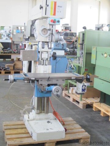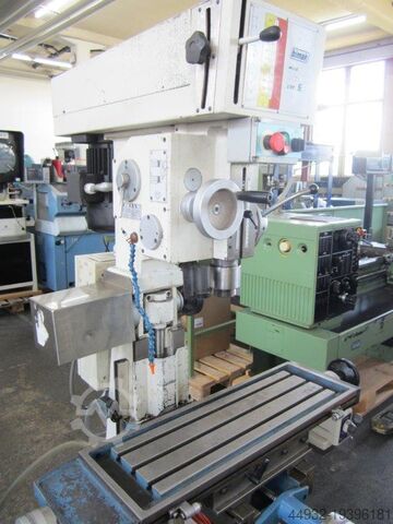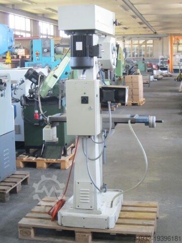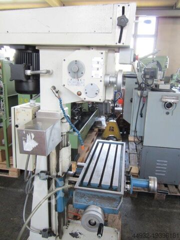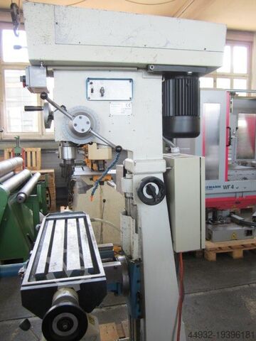 Сверлильно-фрезерный станок, сверлильная способность Ø 40 мм, двухскоростной мотор 1,9/2,2 кВт, размер стола 800x225 мм, скорость шпинделя 45–1650 об/мин, плавная регулировка через вариатор, MK-4, машинный светильник, моторный подъем стола, автоматическая подача, тонкая настройка, ограничитель глубины, система охлаждения, габариты 1250x1100x1900 мм, вес ок. 600 кг.