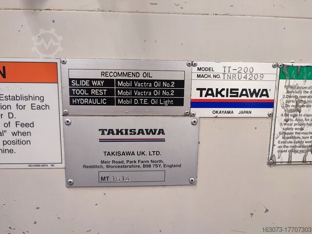 Двухшпиндельный (X+Z) горизонтальный токарный станок с ЧПУ Takisawa TT-200A с портальным штабелером, б/у, исправен.
