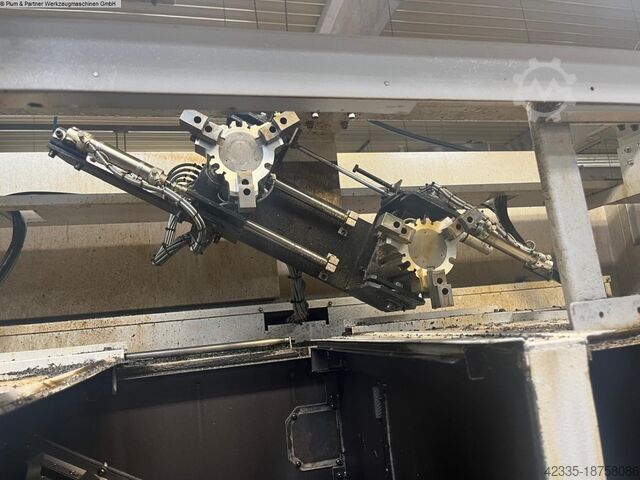 Фронтальный токарный станок – горизонтальный двухшпиндельный станок с портальным загрузчиком Raku Raku и двухсторонним магазином заготовок, с осью C и 10-позиционным револьвером для обеих сторон; приводные инструменты установлены только справа, 14-позиционный магазин палет для заготовок.