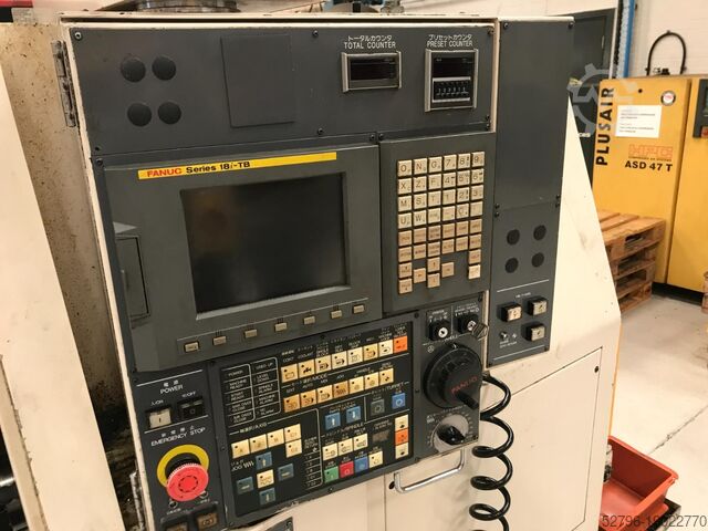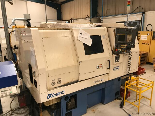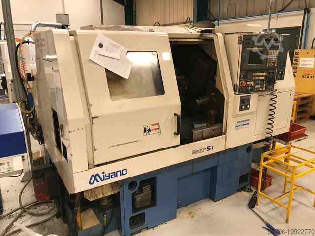 Токарный станок с ЧПУ Miyano BND-51SY, серийный номер: 2WX85413 (02/2005), с системой управления Fanuc Series 18i-TB. Прутковый подающий механизм Iemca Kid 70, серийный номер: 0205120A01 (2005).