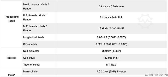 - Дюймовые резьбы: 45 видов / 2~72 ниток на дюйм