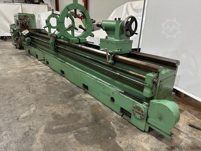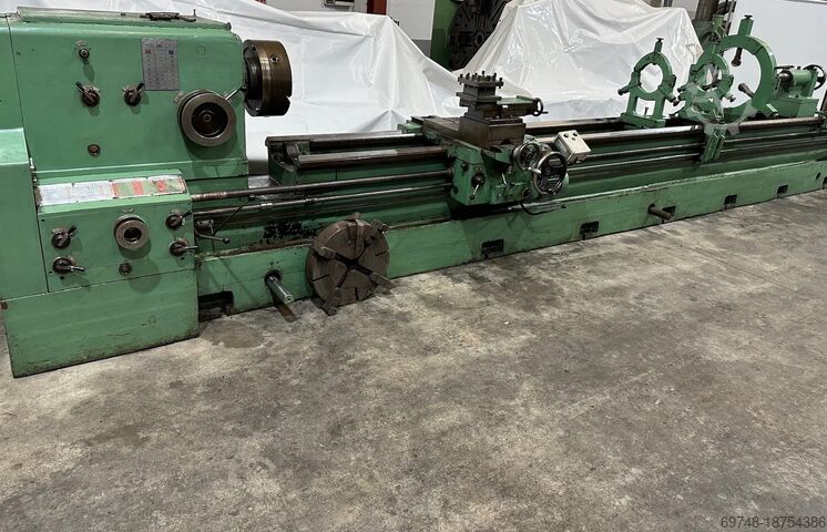 Токарный станок GURUTZPE, модель Super A, расстояние между центрами 6000 мм, диаметр обработки на станине 820 мм, на каретке 550 мм, в вырезе 1150 мм, диаметр хвостовика 82 мм, моторизованная каретка, 16 скоростей 9-500 об/мин, имеет 3 неподвижных люнета.