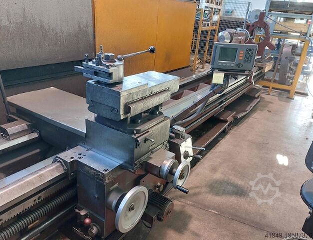Высота центров 550 мм, расстояние между центрами 6 000 мм, мощность привода 30 кВт, цифровой дисплей Heidenhain, трехкулачковый патрон 500 мм, задняя бабка, люнет, планшайба 900 мм, гайка ходового винта неисправна