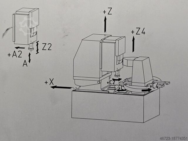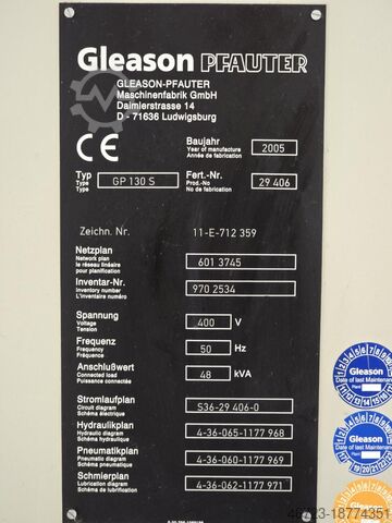макс. диаметр 130 мм, макс. ширина лица 25 мм, мин./макс. Модуль 0,5-4, ходы 500 - 2500 1/мин, диаметр шпинделя 85 мм, ЧПУ Siemens Sinumerik 840D, 400 В 50 Гц 49 кВт, ДxШxВ 6,4x4,5x4,4 м, вес 12 тонн
