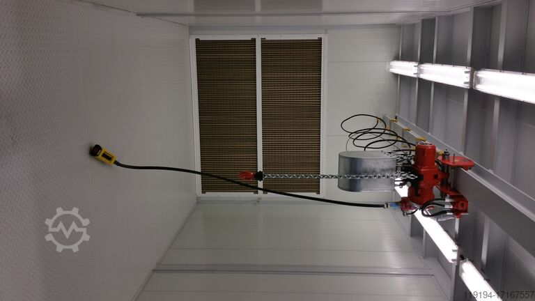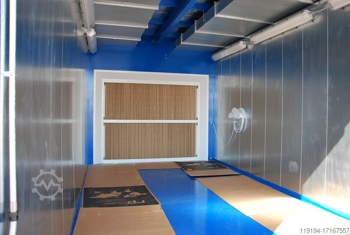 Вытяжная стена для отделения лакокрасочного тумана расположена перед задней стенкой и оснащена многослойными фильтрующими матами. Вытяжная стена состоит из оцинкованного корпуса, окантованного отбойными пластинами, включая различные подвесные и крепежные элементы для фильтрующего оборудования. Мощный и EX-защищенный вытяжной вентилятор с приводным двигателем установлен на консоли в районе задней стенки с внешней стороны контейнера.