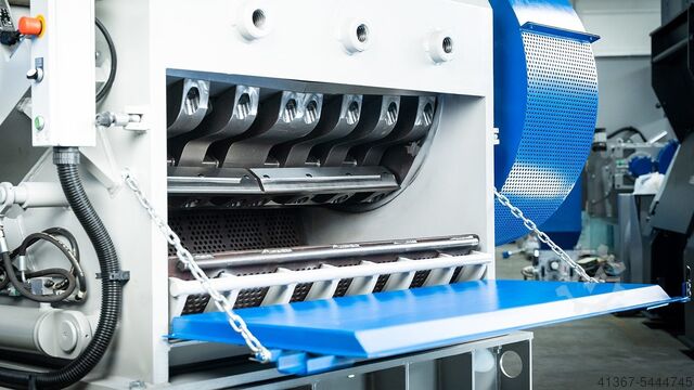 Корпус разделен по диагонали посередине, и верхняя часть с загрузочной воронкой открывается с помощью гидравлики, так что ротор полностью свободен для замены ножей и очистки. Вставка сита также удерживается гидравлически поворачивающейся корзиной сита, поэтому доступ для снятия и установки сита оптимален. Реверсивная ситовая вставка.