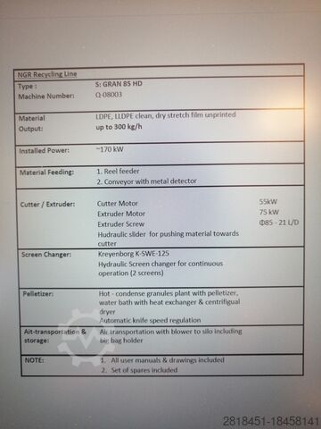 Завод по переработке сухих, чистых отходов пластиковой пленки, включая отходы. Производительность до 250 кг/ч. В настоящее время он находится в эксплуатации и в хорошем рабочем состоянии.