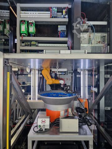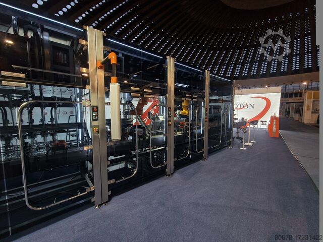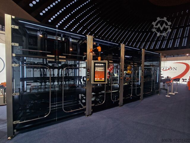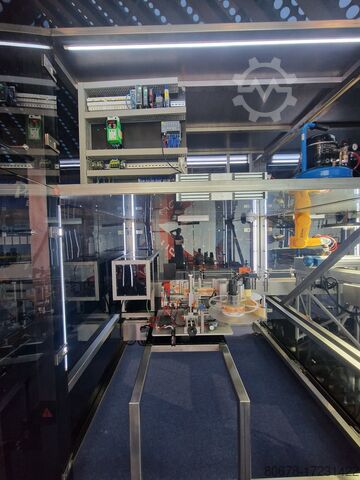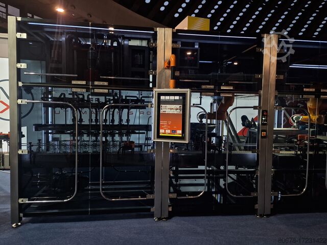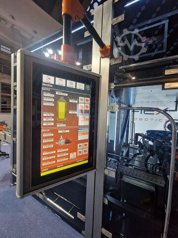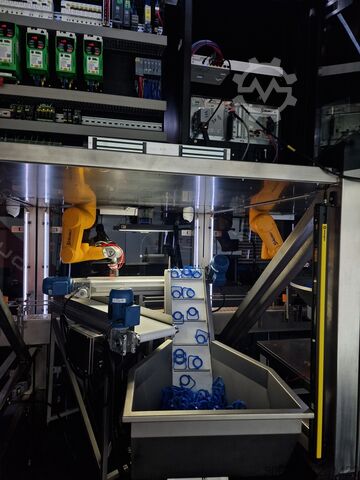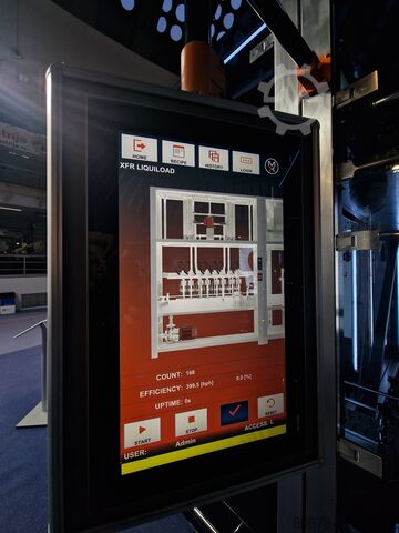 Полностью автоматизированная линия розлива жидких сред с роботизированной укупоркой, автоматической установкой ручек, двусторонней маркировкой, оптическим контролем качества и упаковкой на паллеты.