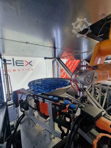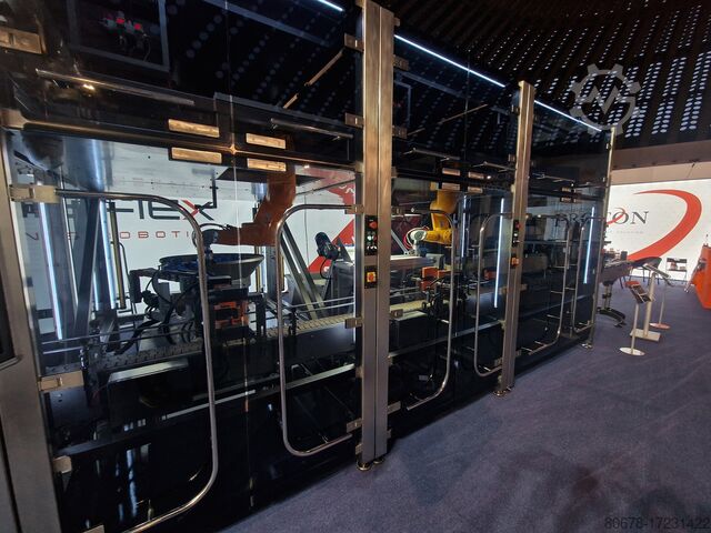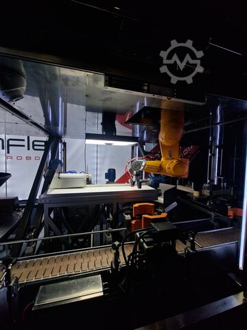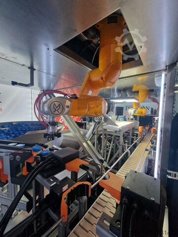 6-осевой робот, оснащенный захватом весом 160 кг для текущего перемещения 8 бутылок на европоддон.