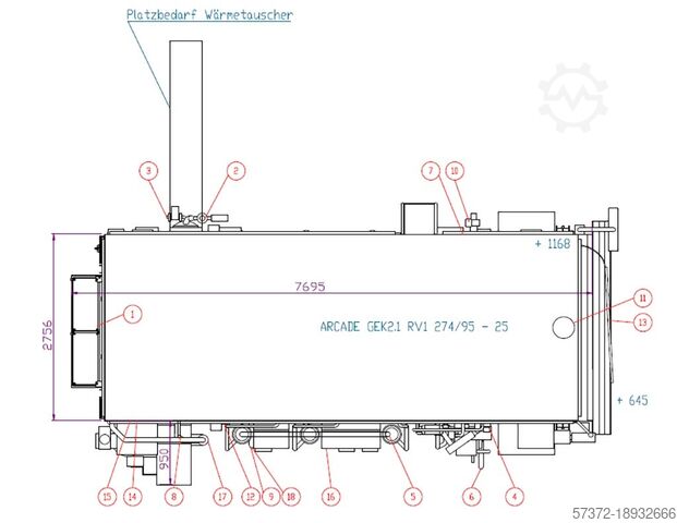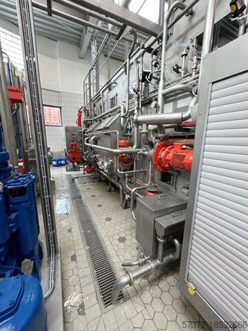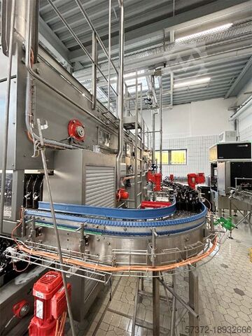 Номинальная производительность: 9500 бутылок/ч (на основе бутылки NRW объемом 0,5 л, 68x260 мм, 370 г), диапазон механического регулирования: 3800–10 450 бутылок/ч, время цикла: 9,47 с, общее количество ячеек для бутылок: 3375, заполнено: 3175, в каждом ряду: 135 рядов корзин, шаг ячеек: 95 мм, шаг цепи: 140 мм, приводные дорожки: 3 дорожки, разгрузочные дорожки: 3 дорожки. Общее время работы: 21,32 мин, общее время погружения: 7,24 мин, время выдержки в каустике: 5,34 мин, время выдержки в каустике: 7,05 мин, время контакта с каустиком: 9,91 мин, общее время ополаскивания: 123 с, общее время распыления: 47 с, расход воды: 2,61 м³/ч, 275 мл/бутылка, расход тепла (работа): 721 715 кДж/ч = 172 247 ккал/ч, 75,97 кДж/бутылка = 18,1 ккал/бутылка, расход тепла (нагрев): 2 880 МДж = 687 467 ккал, общая установленная мощность: 27,2 кВт, мощность насоса: 20,4 кВт, приводы: 5,7 кВт, расход сжатого воздуха (при 6 бар): 0,2 м³/ч, размеры корпуса: 7162x2740x2500 мм. Габаритные размеры: 7162x3540x2730 мм, минимальный проем доступа (ШxВ): 3840x2000 мм, минимальный дорожный просвет: 75±25 мм, высота транспортировки/вывоза: 645/1165 мм, масса пустого: 11 680 кг, рабочая масса: 31 563 кг, нагрузка на пол: 8690 кг/м², нагрузка на сферическую опору: 2130 кг, количество сферических опор: 12. Машина работала около 6 месяцев, поэтому она почти как новая, включая документацию. Возможен выездной осмотр.