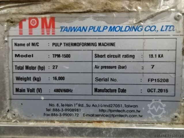 Мы продаем 3 бывшие в употреблении термоформовочные машины для бумажной массы в хорошем состоянии и дополнительное оборудование. Модель TPM-1500, изготовленная компанией "Taiwan Pulp Molding" - одним из мировых лидеров в этой области.