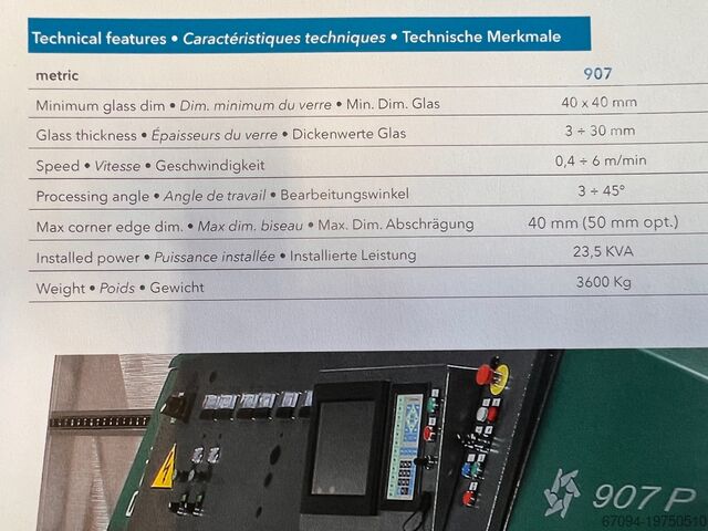 Модель 907 B способна снимать фаску высотой до 50 мм. За один проход машина изготавливает фаску и снимает кромку на лицевом крае стекла.