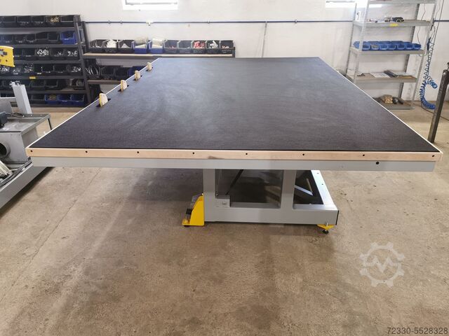 Стол для обработки / сборки стекла. Размеры 340 см x 240 см. Стол поднимается на газовых пружинах. Покрыта стеклянным войлоком. Стол на колесах - мобильный. Мы рекомендуем другие наши продукты для стекольной промышленности.
