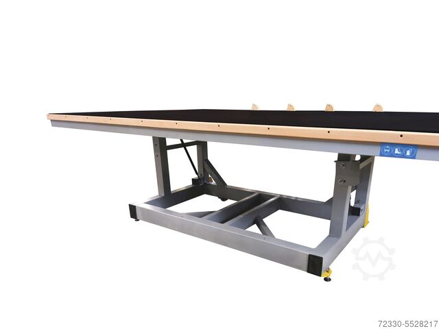 Стол для обработки / сборки стекла. Размеры 280 см x 186 см. Стол поднимается на газовых пружинах. Покрыта стеклянным войлоком. Стол на колесах - мобильный. Мы рекомендуем другие наши продукты для стекольной промышленности.