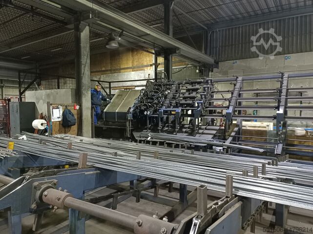 2006 г., арматура Eurobend CNC 16x4 из бухты, правильно-отрезной станок, в рабочем состоянии. 4 разматывателя по 5 тонн с пневматическими тормозами. 4 ротора для выпрямления арматурной проволоки диаметром 8-10-12-16 мм и автоматической резки с помощью гидравлических подвижных резаков. Резка одной или даже до 4 линий одновременно.