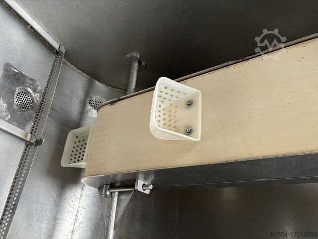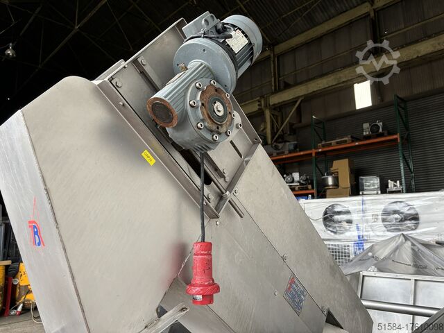 Нержавеющий, ковшовый элеваторный конвейер, расположенный внутри нержавеющего бака объемом 500 л с рециркуляционным насосом, ранее использовался для мойки оливок, поднимает до 1800, ширина ленты 250 мм, общая длина системы 2700 мм, два в наличии, 3Ph