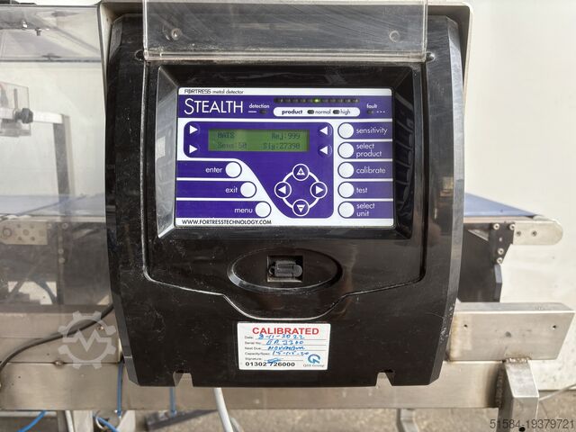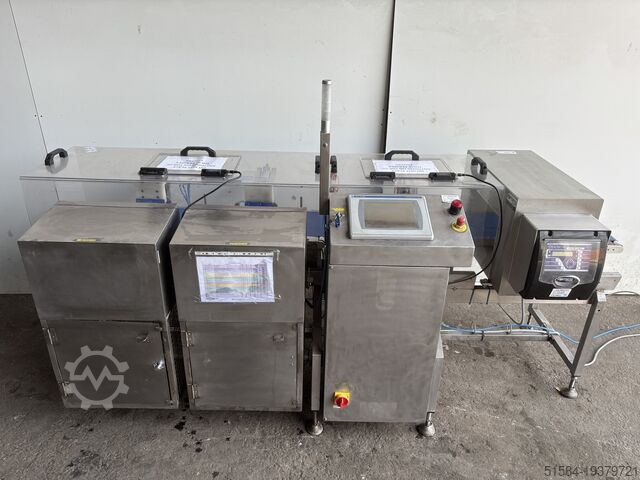 2015 г., нержавеющая сталь, комбинированный металлодетектор и чеквейер, диапазон веса от 10 г до 10 кг, взвешивающая платформа 400 мм x 250 мм, апертура металлоискателя 440 мм x 150 мм, с пневматическим отводом в бункеры для отбраковки, общая длина 2750 мм