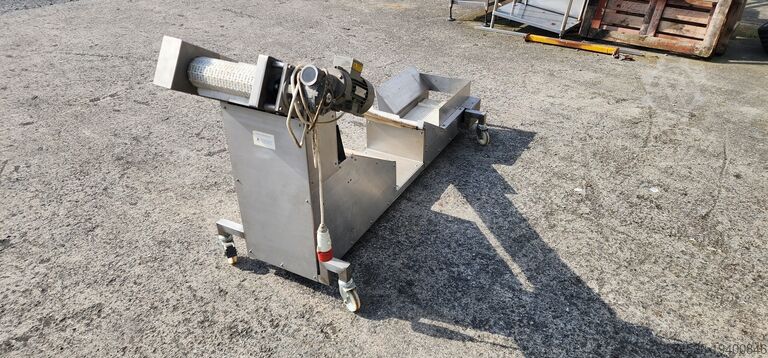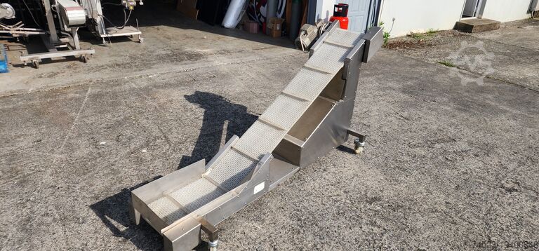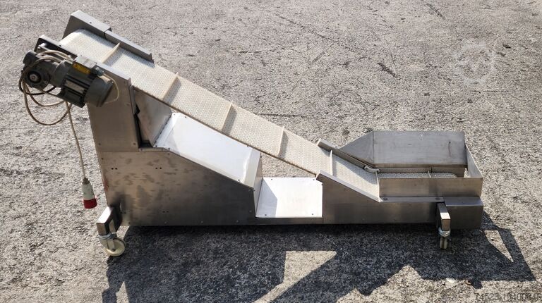Хороший бывший в употреблении, снятый с производства транспортер из нержавеющей стали с модульной лентой, подходит для сотрудничества с фасовочным автоматом — для приёма наполненных мешков и подъёма их на рабочую высоту. Данный конвейер изготовлен из нержавеющей стали и был спроектирован и построен с возможностью установки металлодетектора (см. зону, свободную от металлов). Полностью укомплектован, оснащён поворотными колесами с фиксаторами и тормозами. Трёхфазный мотор-редуктор. Модульная лента с направляющими.
