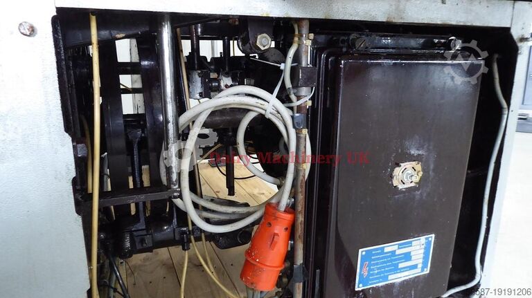 Упаковочная машина для обертывания в фольгу, предназначенная для фасовки таких продуктов, как масло, сало, маргарин, творог или сыр, в алюминиевую фольгу или пергаментную бумагу. Оборудование находится в удовлетворительном механическом и электрическом состоянии (капитально обновлено компанией Schuy, заказ № 13632-01). Формат машины — стандарт: 250 грамм, 100 x 75 x 35 мм, с нижней загибкой. Производительность — до 50 порций в минуту. Подача масла осуществляется через алюминиевый лоток с алюминиевыми шнеками. Дозирующая станция из алюминия. Машина оснащена модернизированной фотоглазкой на подаче бумаги, что обеспечивает точное позиционирование печати на фольге. На выходе установлен транспортер.