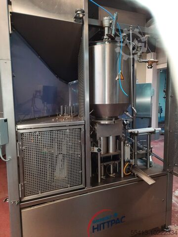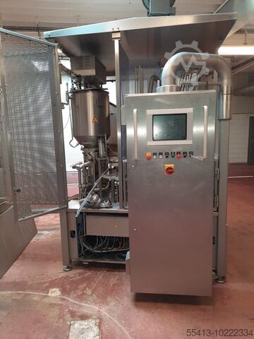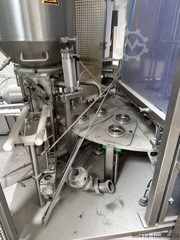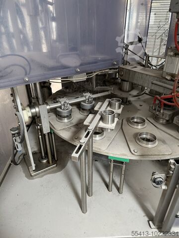 Для горячего розлива жидких продуктов, включая сервоприводное подъемное устройство стакана и бункер со скребковой мешалкой и загрузочными клапанами (с возможностью безразборной мойки), дозирование алюминиевого уплотнения с помощью вакуума и запайки наконечника, термосваривание алюминиевого уплотнения, станцию защелкивающейся крышки и подачу на выход.