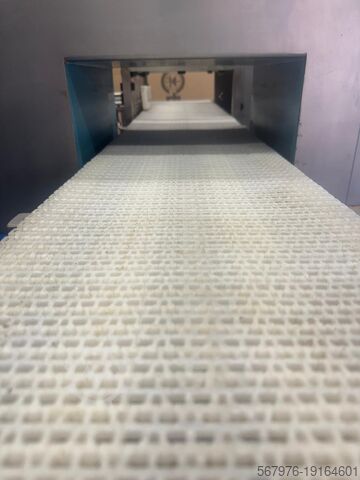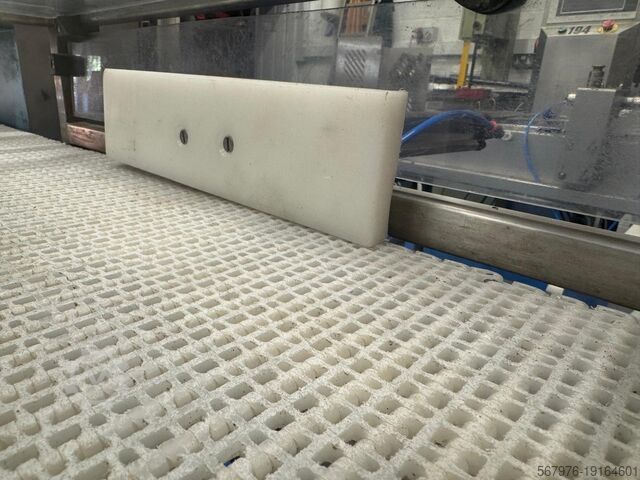Эта машина движется слева направо с модульной лентой и пневматическим толкателем, отбраковывающим в запираемый контейнер.