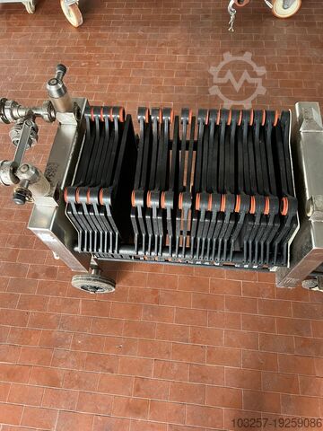 Длина стойки для 60 пластин. Мобильная версия с рулевой колонкой и колесами. Новый манометр с трубкой Бурдона, оснащенный 39 пластиковыми фильтрующими пластинами и 2 пластиковыми концевыми пластинами. Соединения клапанов продукта.