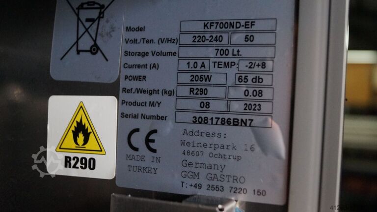 Холодильник из нержавеющей стали GGM KF700ND-EF, год выпуска 2023, GN 2/1, 700 литров, температура: от -2 до +8 °C, внешние размеры: Ш x Г x В: 700 мм x 810 мм x 2 050 мм, конвекционное охлаждение, автоматическое размораживание, серийный номер 3081786BN70