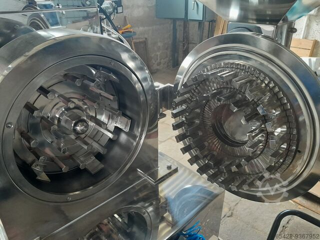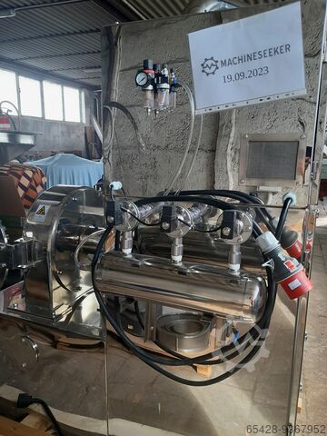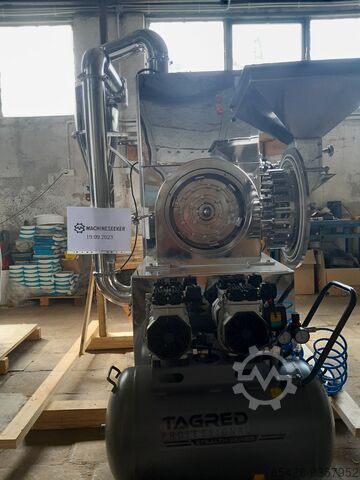 Мельница для тонкого помола муки, кофе, сушеных специй и т.д. Диапазон помола 20-120 меш. Производительность 100-400 кг в час. Скорость вращения двигателя 3400 в мин. Вес машины 600 кг. Мощность, необходимая для работы машины 11 кВт. Машина имеет дополнительный вытяжной пылевой фильтр. Вся машина изготовлена из нержавеющей стали SUS304.